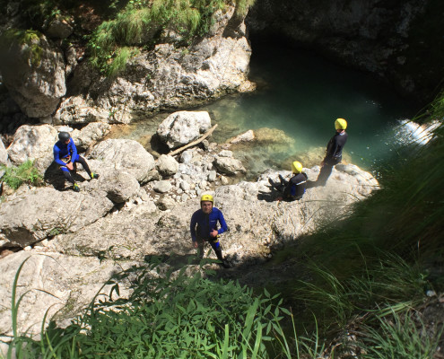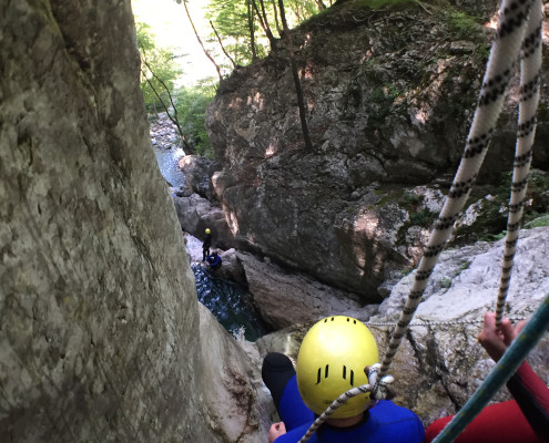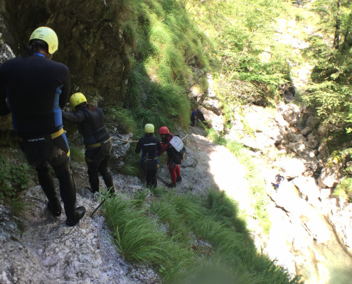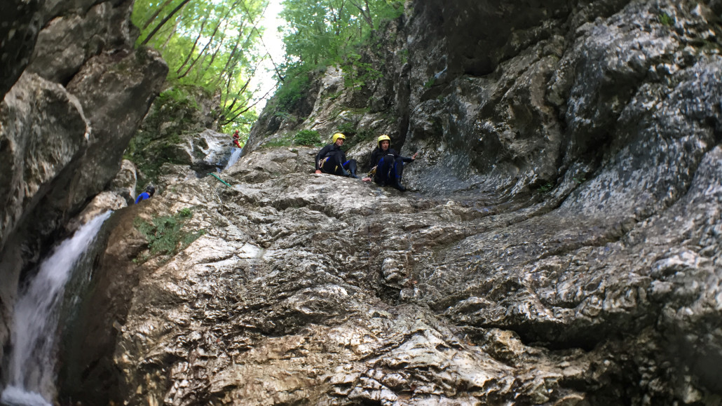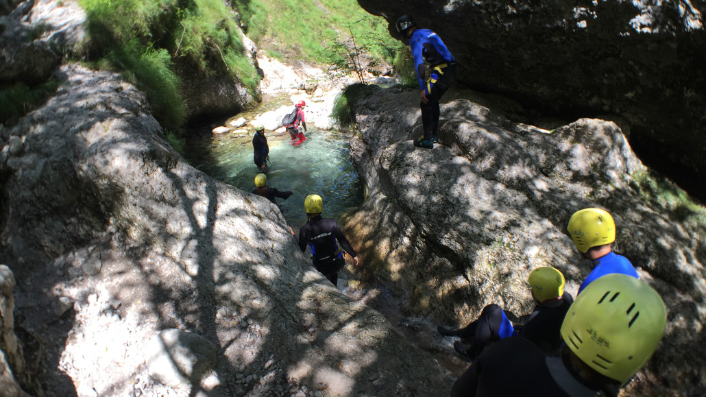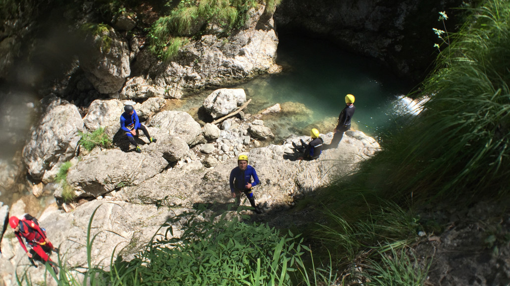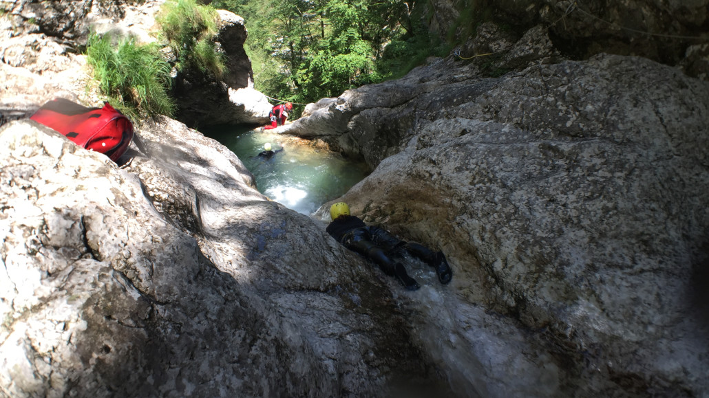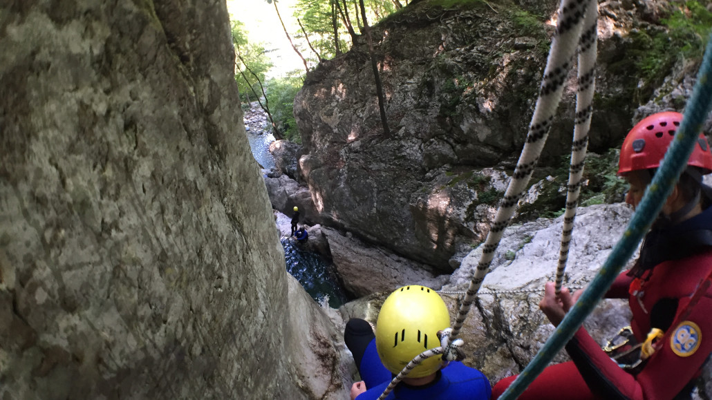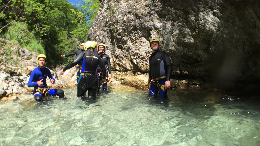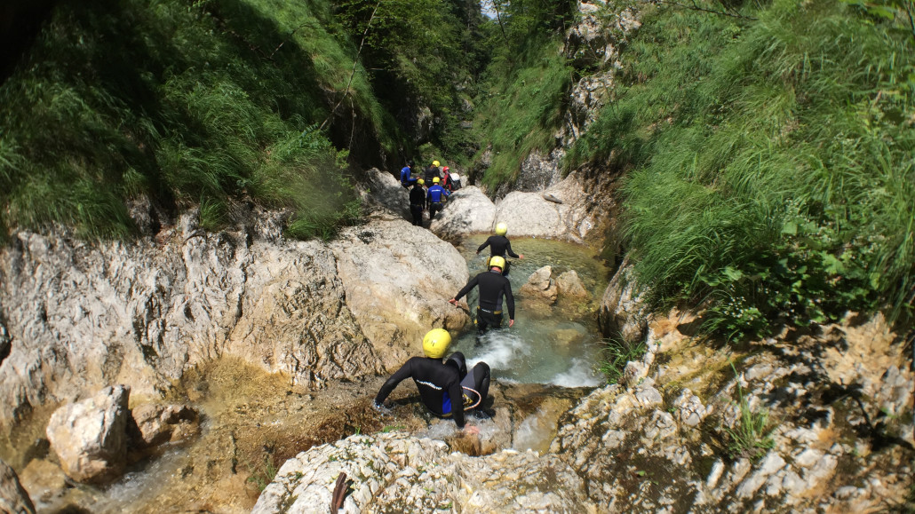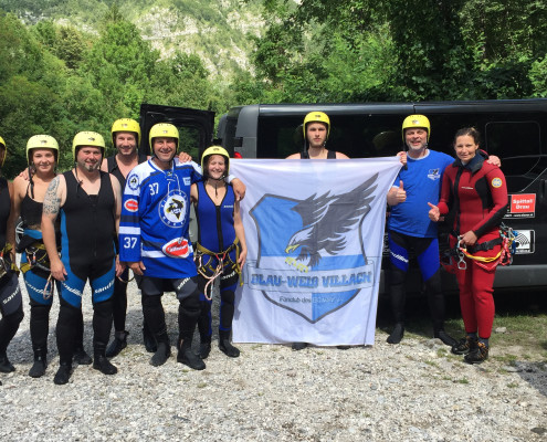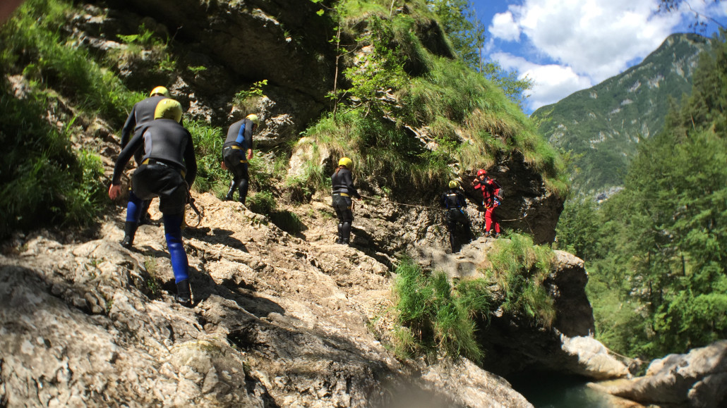 Im Zuge unseres Sommerprogramms ging es am 16. Juli 2017 für einige Blau-Weiß Villach Mitglieder ins schöne Sočatal nach Slowenien zum Canyoning. Nach einstündiger Fahrt durch Italien und über den Predilpaß erreichten wir schlußendlich das Raftingcamp in Srpenica. Dort fassten wir unsere Ausrüstung aus und fuhren zum Startpunkt der Tour. 30 Minuten sollte unser Aufstieg durch Wald und über schmale Wege zu unserem Einstiegspunkt in den Fluß Sušec sein. Die letzten Einzelheiten wurden besprochen und wir erhielten noch einige Anweisungen unseres Guides bevor es los ging…aber seht selbst…:)