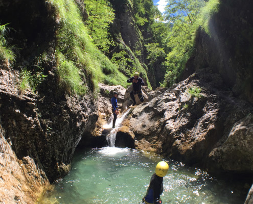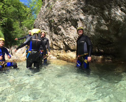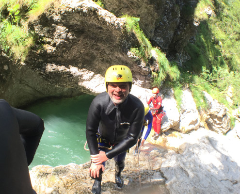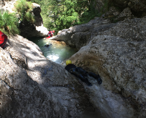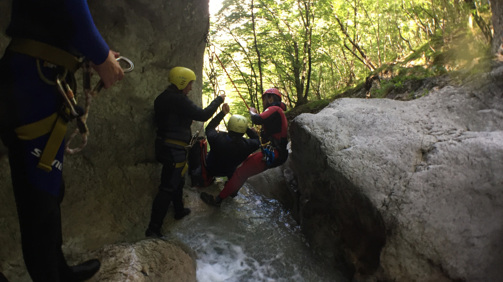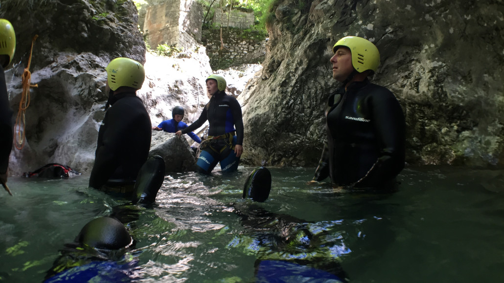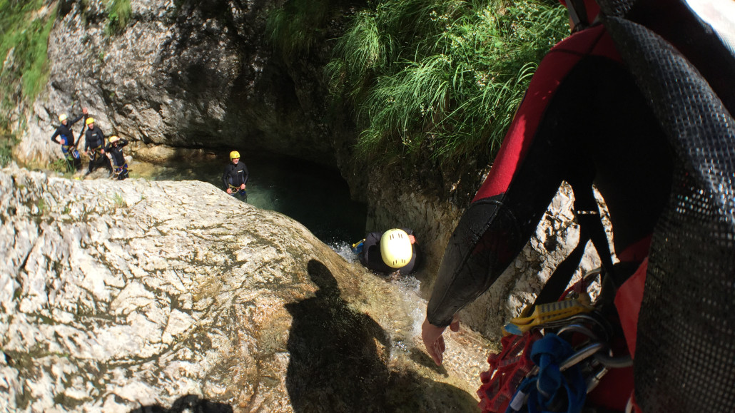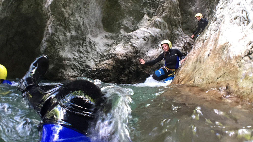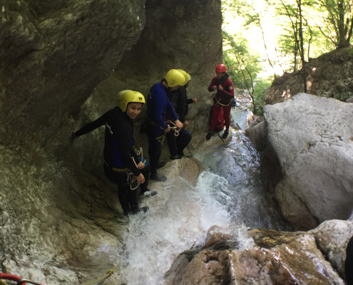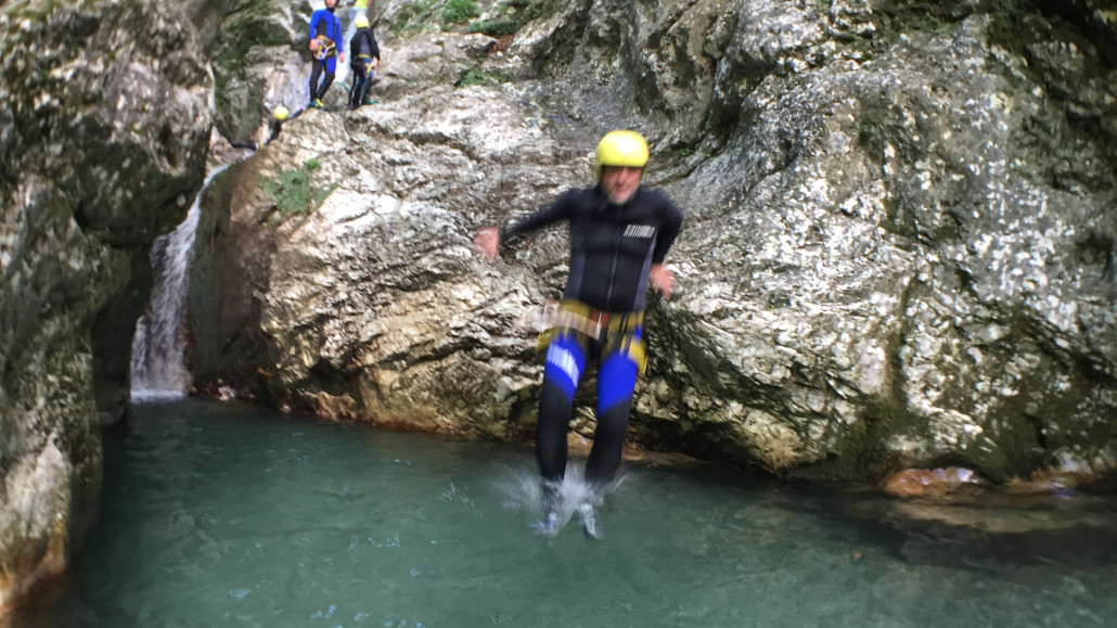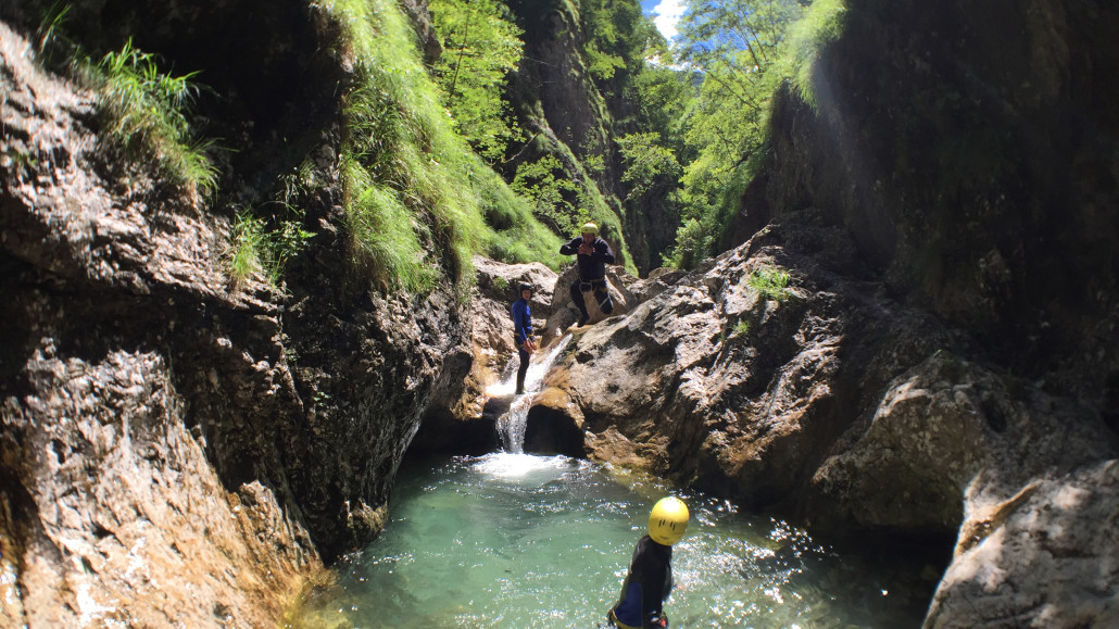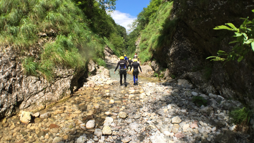 Im Zuge unseres Sommerprogramms ging es am 16. Juli 2017 für einige Blau-Weiß Villach Mitglieder ins schöne Sočatal nach Slowenien zum Canyoning. Nach einstündiger Fahrt durch Italien und über den Predilpaß erreichten wir schlußendlich das Raftingcamp in Srpenica. Dort fassten wir unsere Ausrüstung aus und fuhren zum Startpunkt der Tour. 30 Minuten sollte unser Aufstieg durch Wald und über schmale Wege zu unserem Einstiegspunkt in den Fluß Sušec sein. Die letzten Einzelheiten wurden besprochen und wir erhielten noch einige Anweisungen unseres Guides bevor es los ging…aber seht selbst…:)